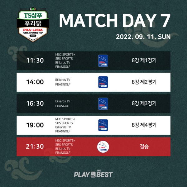 그리고 9월 11일 저녁 9시 30분에는 LPBA 결승전이 예정되었습니다. 프로당구대회의 모든 경기는 지상파 방송중계뿐 아니라 유튜브(PBATV) 등을 통해서도 실시간으로 시청할 수 있습니다.