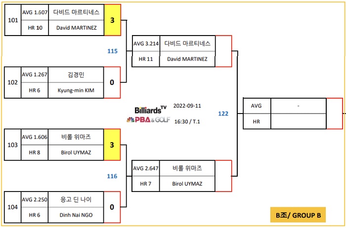 다비드 마르티네스 - 김경민 당구 선수간의 16강 경기 결과는 마르티네스 당구선수가(에버리지 3.214) 김경민 당구 선수를 3대 0으로 승리하며 TS샴푸 푸라닭 PBA 챔피언십 8강 대진표에 이름을 올렸습니다. 비롤 위마즈 - 응고 딘 나이 선수간의 16강 경기 결과는 비롤 위마즈 선수(에버리지 2.647)가 응고 딘 나이 선수를 3대0으로 이기고 TS샴푸 푸라닭 PBA 챔피언십 8강에 진출하였습니다.