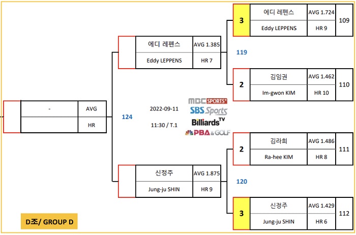 우승컵을 한 번씩 들어 올린 적이 있는 PBA 투어 챔피언들간의 대결입니다. 쿠드롱의 지인이자 친구로 같은 벨기에 출신인 에디 레펜스 선수는 PBA투어에서 우승하고 우승 세레머니로 당구테이블에 뛰어 오르는 모습을 보여주었습니다. 레펜스 선수(에버리지 1.385)는 16강에서 강호 김임권 당구선수를 3대2로 이기고 올랐습니다.