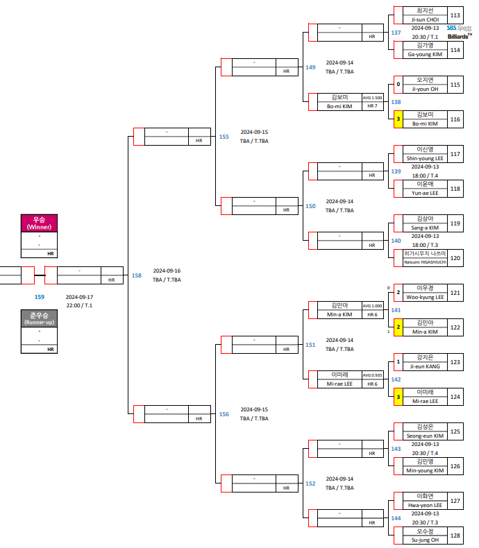 | 크라운해태 LPBA 챔피언십 2024 한가위 16강 대진표 확정 (1) | 2024.09.14 |