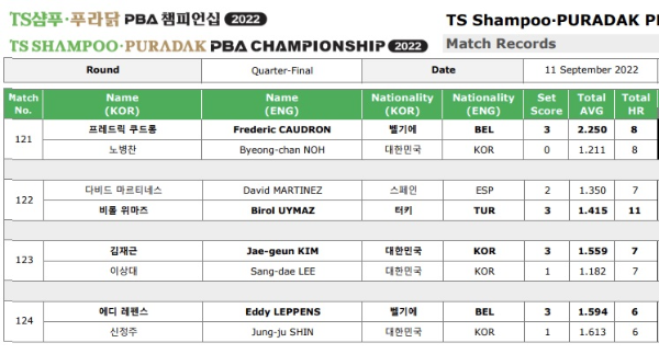 TS샴푸 푸라닭 PBA챔피언십 4강 진출자는 쿠드롱, 비롤 위마즈, 김재근, 에디 레펜스