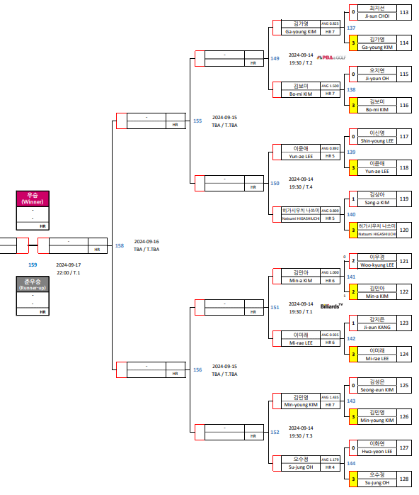 | 크라운해태 LPBA 챔피언십 2024 한가위 - 8강 대진표 16강 경기결과 (1) | 2024.09.15 |