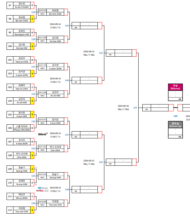| 크라운해태 LPBA 챔피언십 32강 대진표 - 프로당구 2024-25 시즌 (1) | 2024.09.12 |