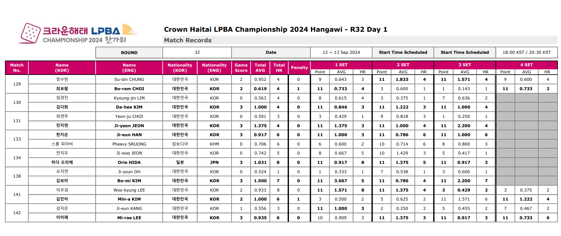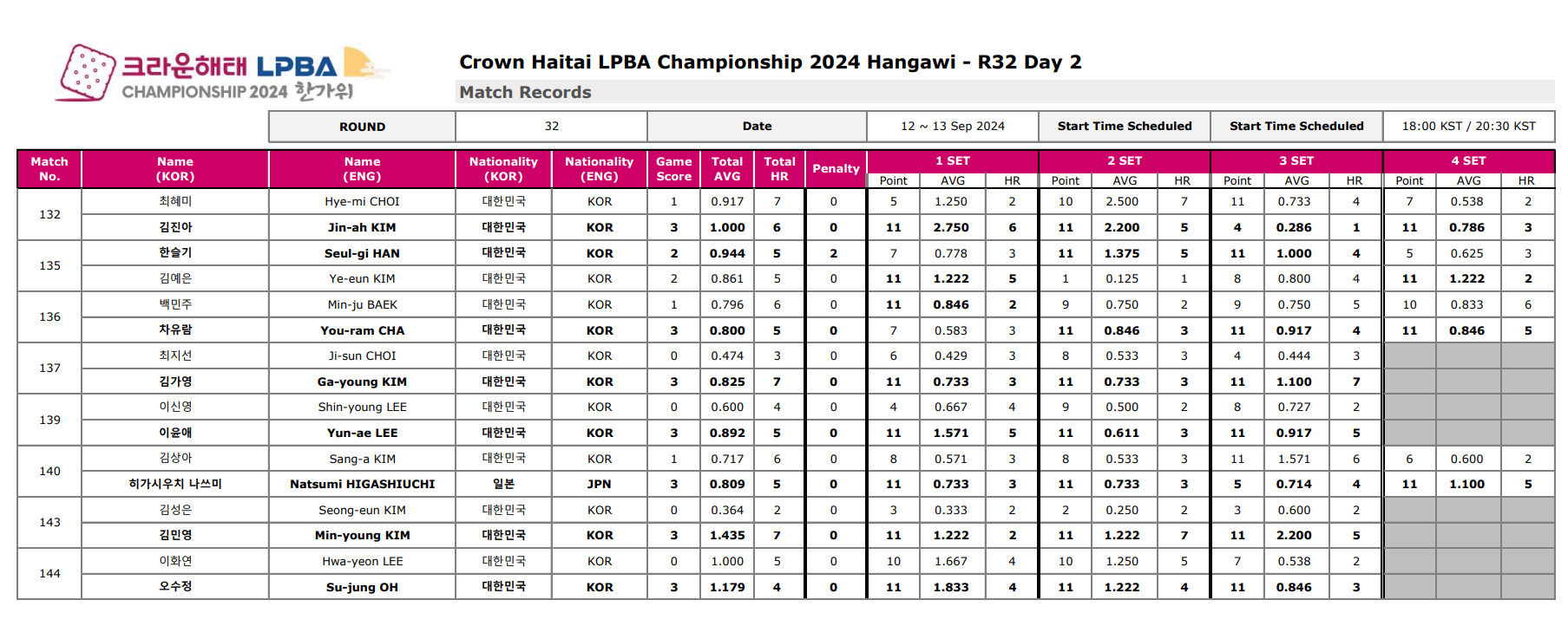 ■ 크라운해태 LPBA 챔피언십 2024 한가위 32강 경기결과