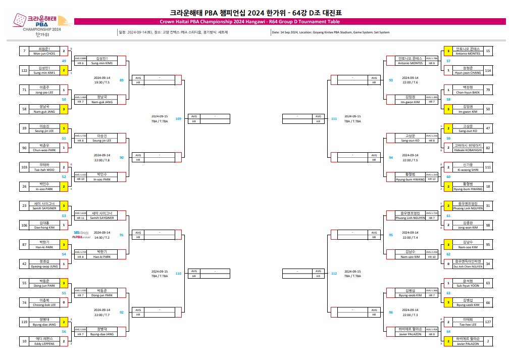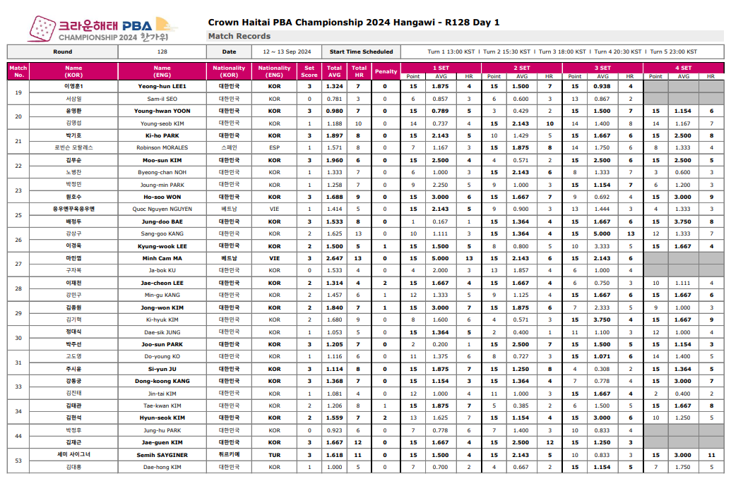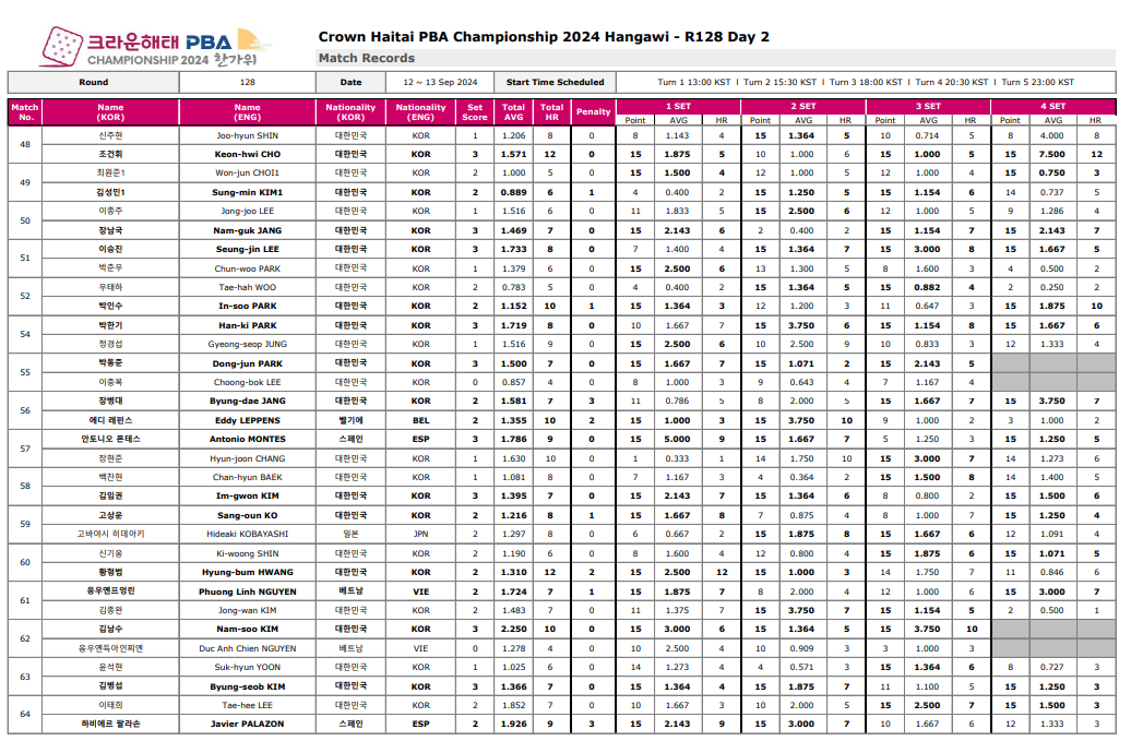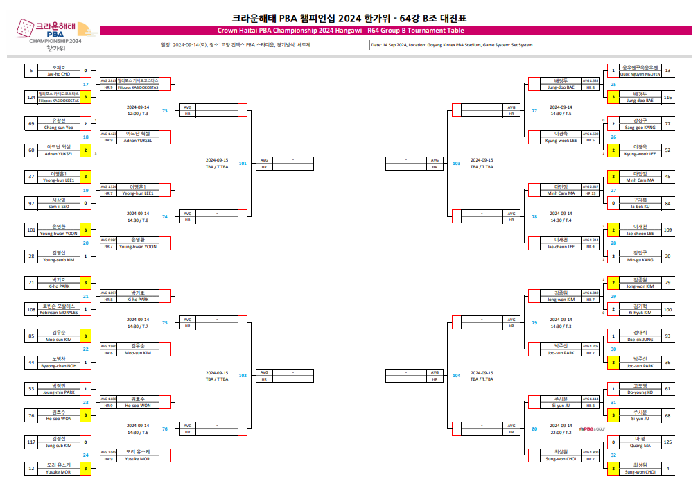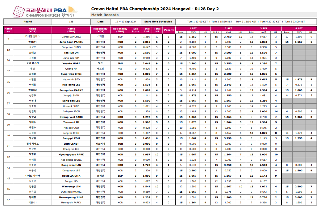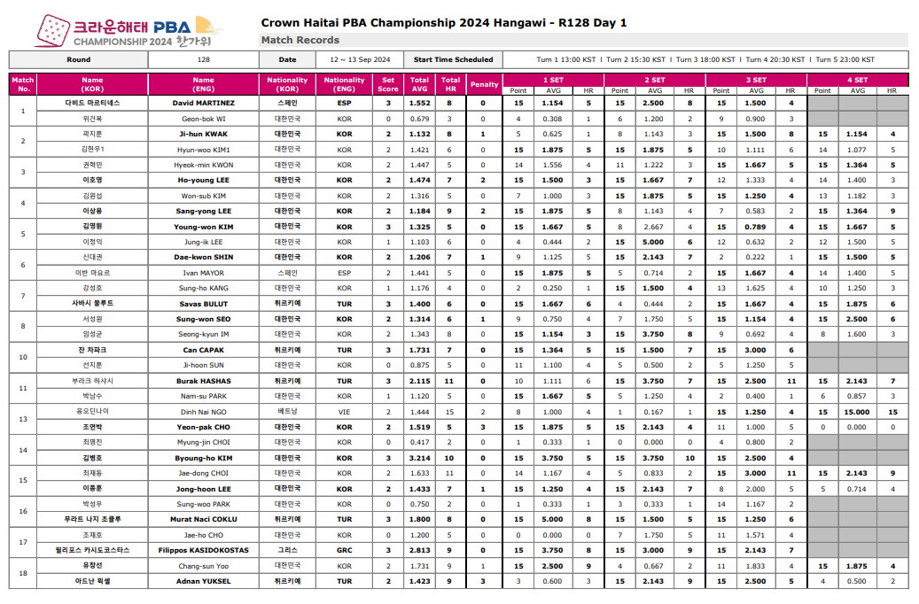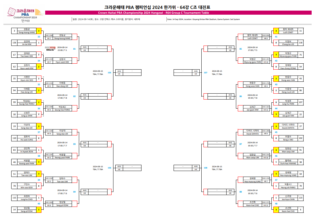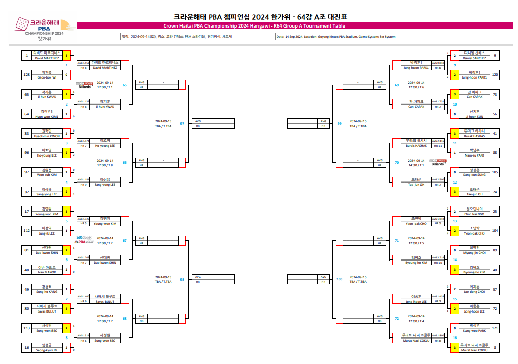 1. 크라운해태 PBA 챔피언십 2024 한가위 128강 경기결과