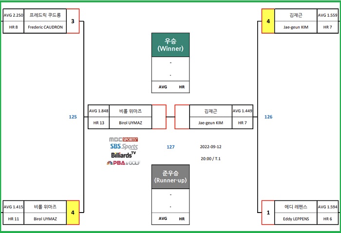 또한 두 선수의 올시즌 종합 전적을 12전 10승 2패로 동일합니다. 준결승전 경기결과, 게임 에버리지는 쿠드롱을 상대한 비롤 위마즈가 1.848로 에디 레펜스를 상대하며 1.449를 기록한 김재근 당구선수보다 조금 앞서있습니다. 하지만 프러당구 경기는 상대적임으로 경기가 끝나기 전까지는 아무도 알 수 없습니다. 두 선수의 명승부를 함께 응원해 주시기 바랍니다.