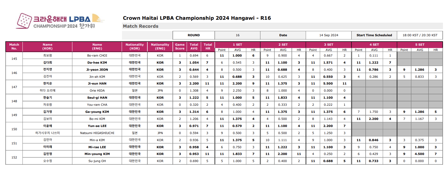 ■ 크라운해태 LPBA 챔피언십 2024 한가위 16강 경기결과