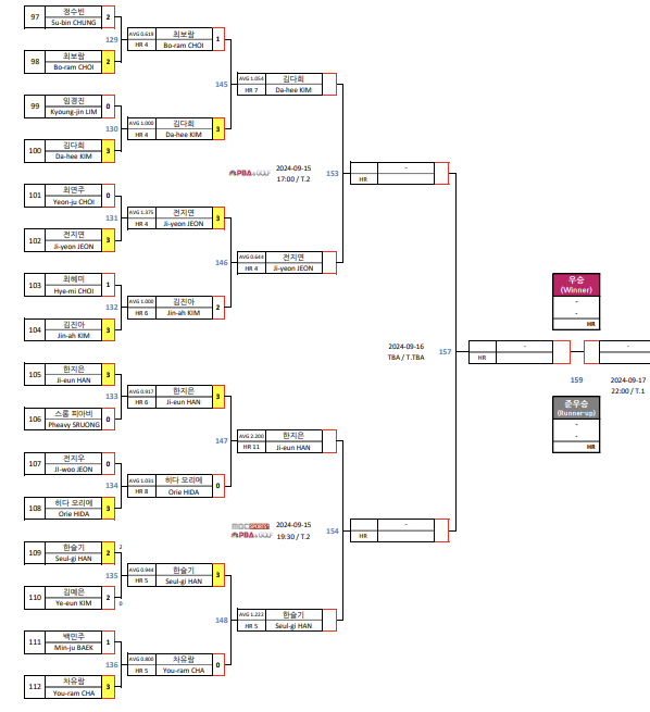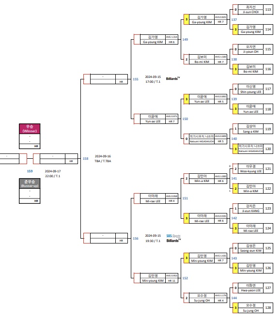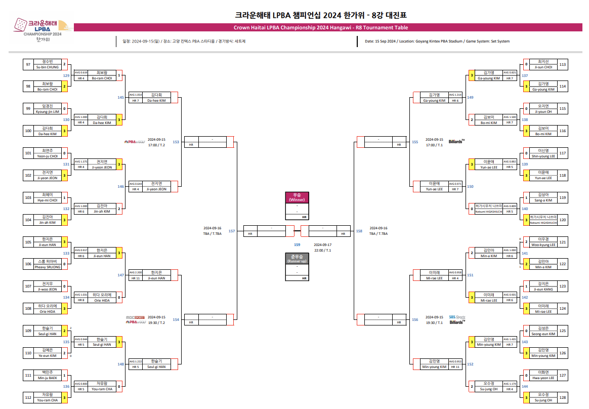 | 크라운해태 LPBA 챔피언십 2024 한가위 16강 대진표 확정 (1) | 2024.09.14 |