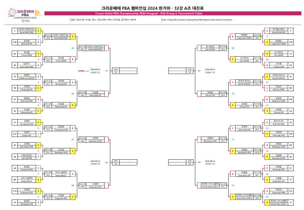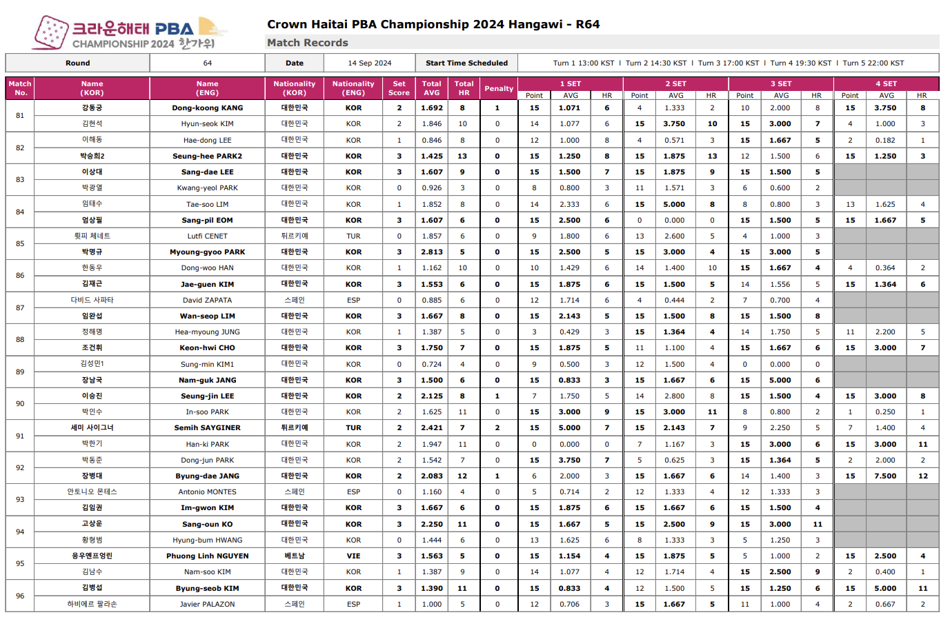 1. 크라운해태 PBA 챔피언십 2024 한가위 64강 경기결과