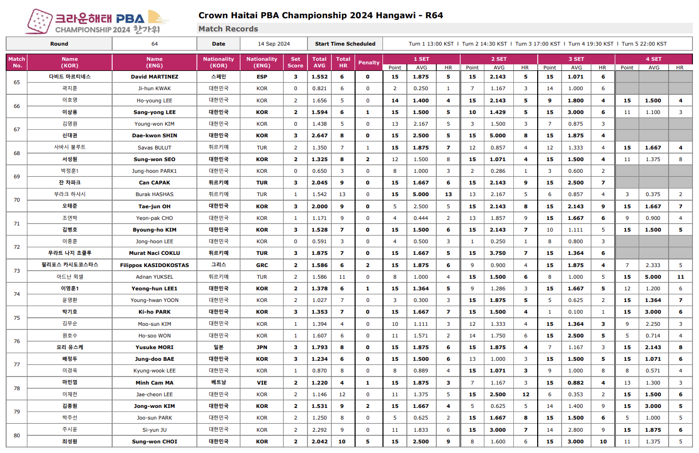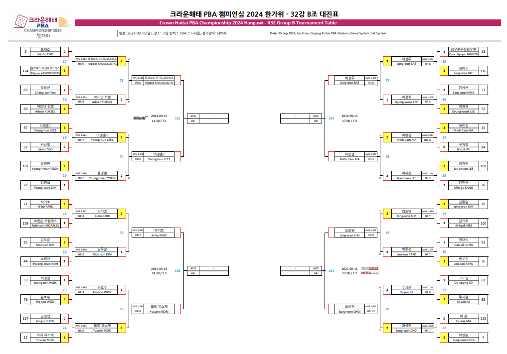 1. 크라운해태 PBA 챔피언십 2024 한가위 64강 경기결과