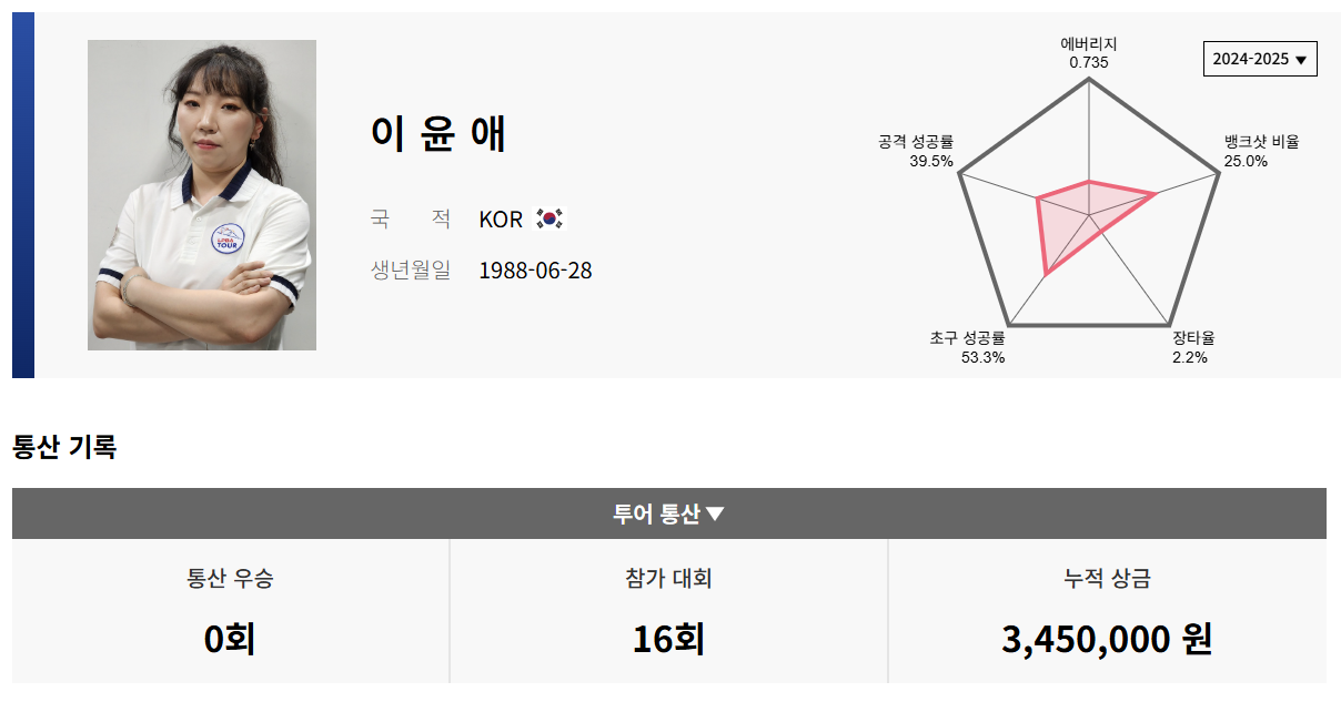 이윤애 당구선수에 대하여 아시나요? 이 페이지는 프로당구 2024-25시즌에 갑자기 나타나 이신영 선수를 꺽은 이윤애 선수의 LPBA투어 경기지표 및 경기결과를 종합 정리하는 이윤애 당구 데이터 베이스입니다.
