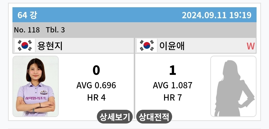 이윤애 당구선수는 크라운해태 LPBA 2024 한가위대회 64강에서 애버리지 1.087을 기록하면서 용현지 선수를 이겼습니다.