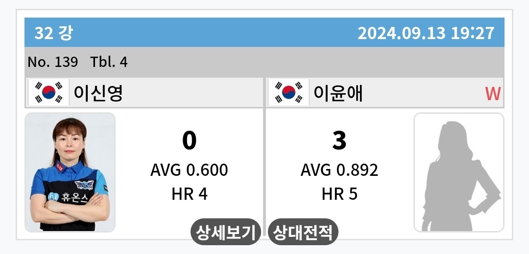 | 웰컴저축은행 LPBA 챔피언십 16강 대진표 최종 - 32강 경기 결과(24-25시즌) (0) | 2025.01.26 |