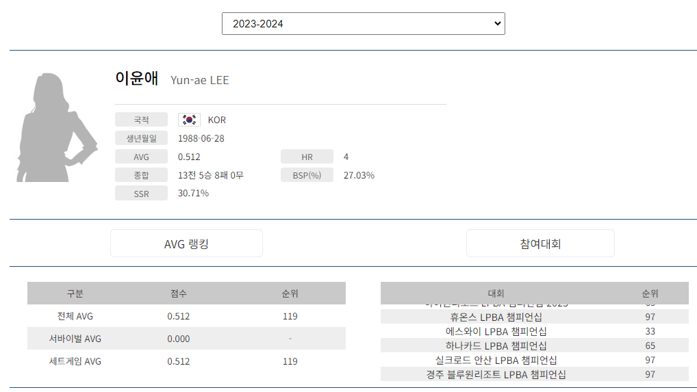 ■ 이윤애 당구선수 LPBA투어 시즌별 경기결과