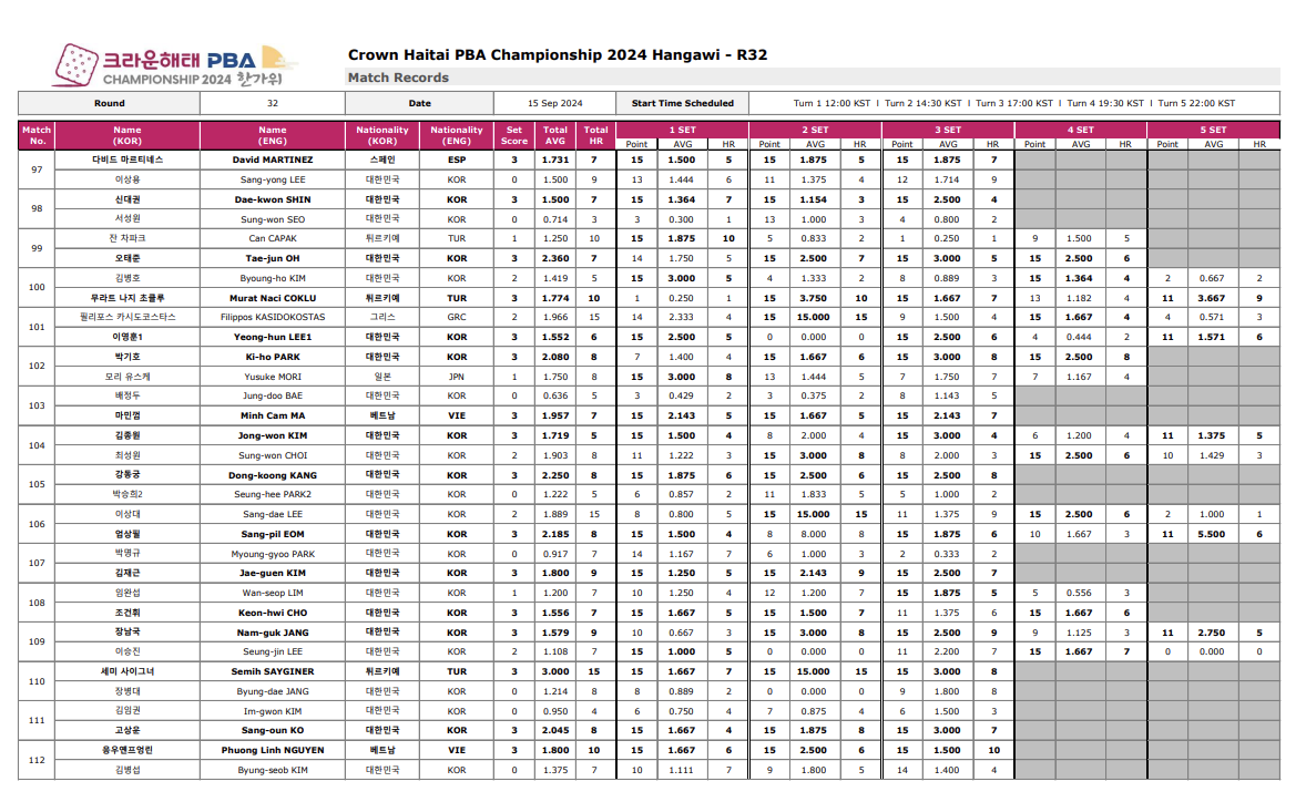 1. 크라운해태 PBA 챔피언십 2024 한가위 32강 경기결과