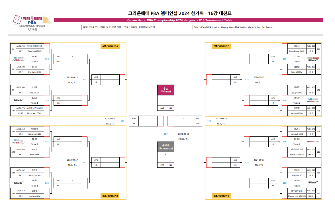 2. 크라운해태 PBA 챔피언십 2024 한가위 16강 대진표