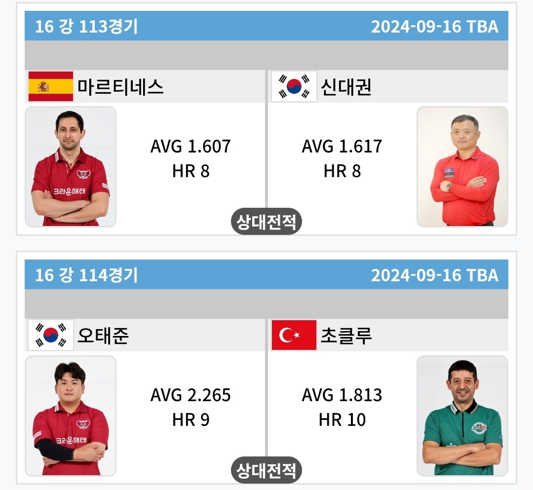 | 크라운해태 PBA 챔피언십 2024 한가위 8강 대진표 - 16강 경기결과 (1) | 2024.09.17 |