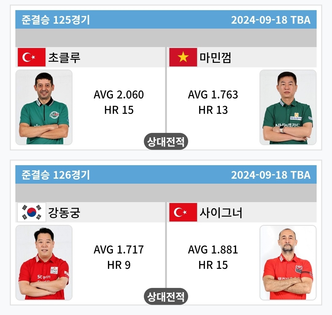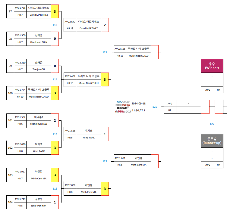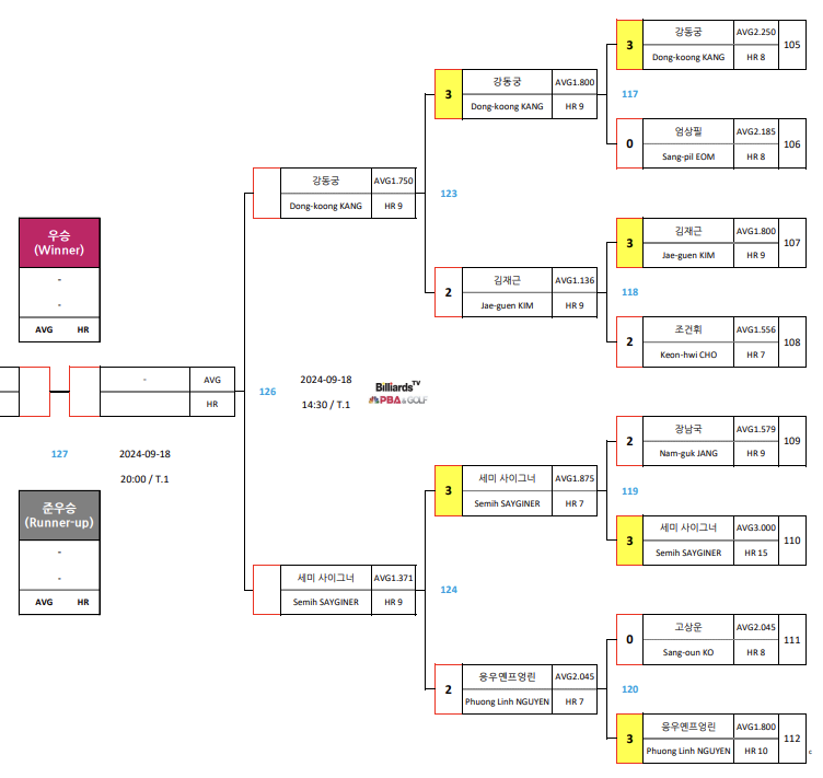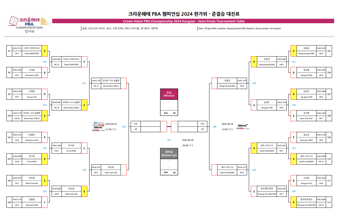 | 크라운해태 PBA 챔피언십 2024 한가위 대회의 결승 대진표 - 4강 경기결과 (2) | 2024.09.18 |