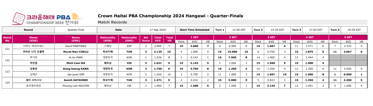1. 크라운해태 PBA 챔피언십 2024 한가위 8강 경기결과