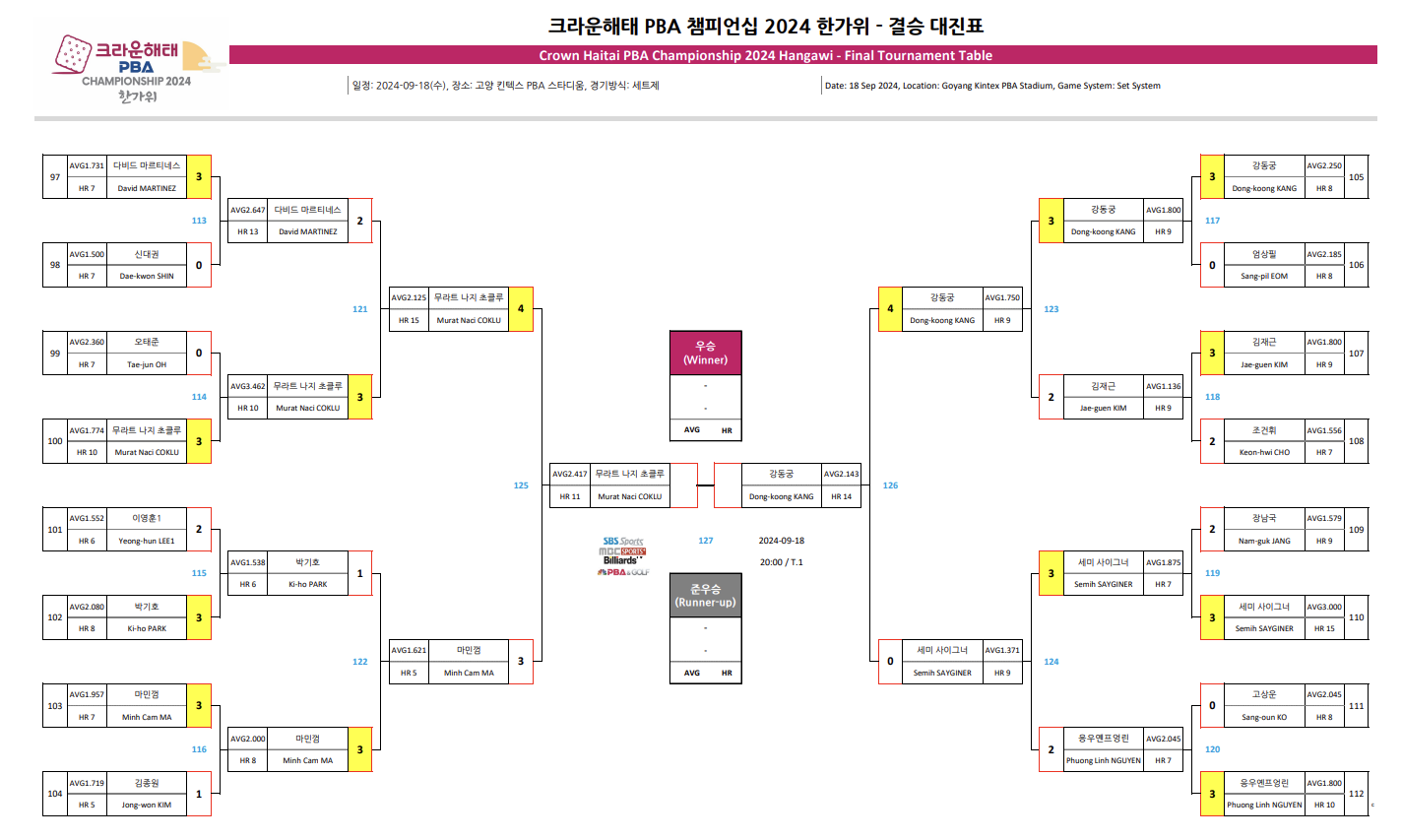 | 크라운해태 PBA 챔피언십 2024 한가위 8강 대진표 - 16강 경기결과 (1) | 2024.09.17 |