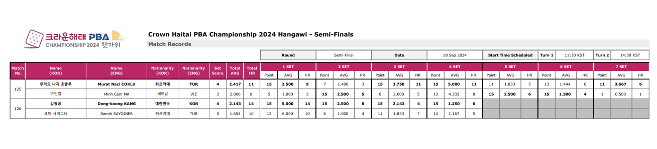 1. 크라운해태 PBA 챔피언십 2024 한가위 4강 경기결과