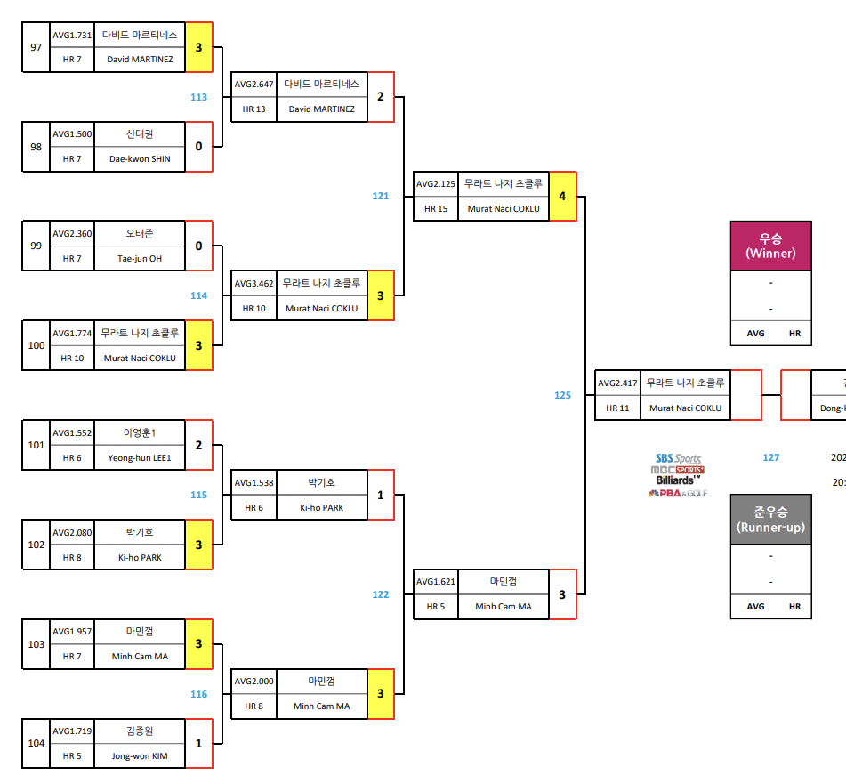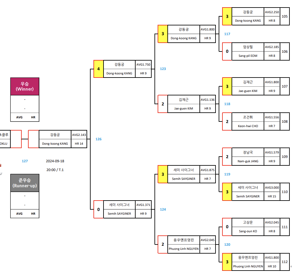 | 크라운해태 PBA 챔피언십 2024 한가위 4강 대진표 - 8강 경기결과 (5) | 2024.09.17 |