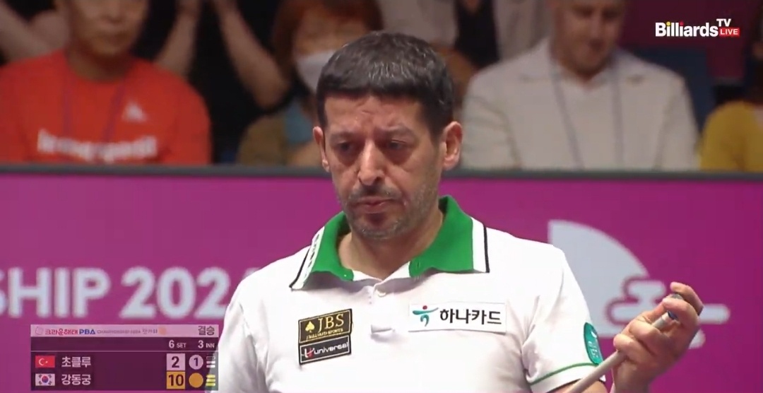 튀르키예 3쿠션 전사 무랏 나시 (무라트 나지) 초클루와 한국의 강동궁은 4세트까지 세트 스코어 2대 2로 팽팽한 접전을 펼쳤습니다. 5세트에서 강동궁은 14점에 먼저 오른 초클루를 14:8에서 6점을 몰아쳐 세트 승리를 가져갔습니다.