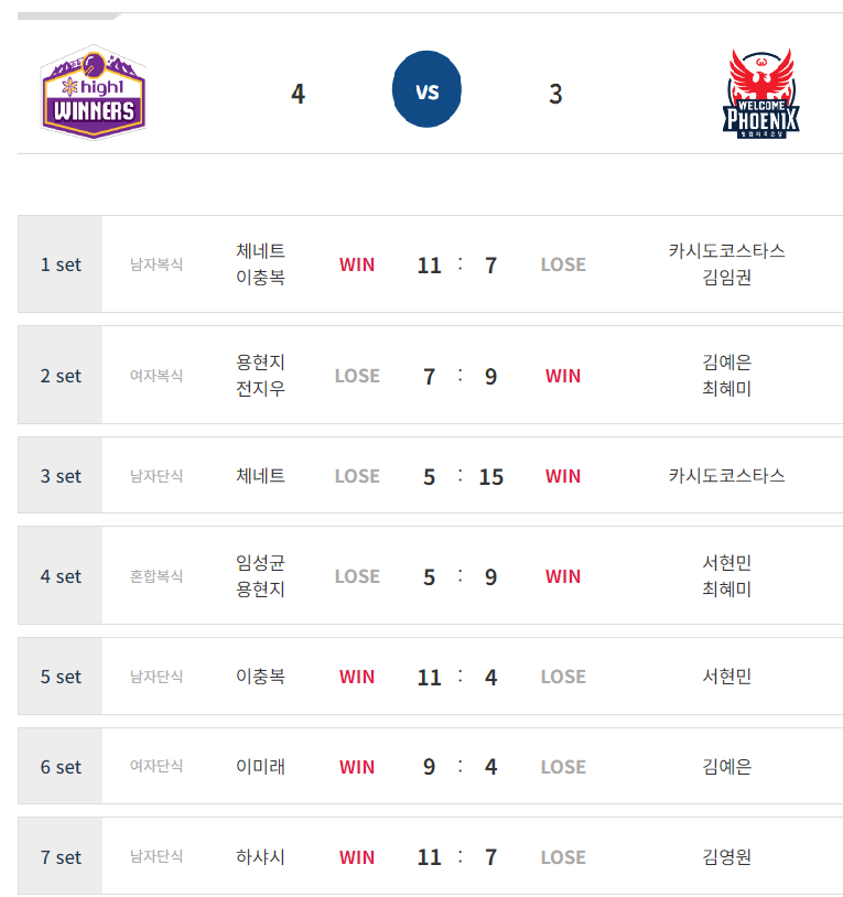 이밖에 하이원리조트도 웰컴저축은행을 상대로 세트스코어 1:3 패배 직전서 이충복-이미래-부라크 하샤시(튀르키예)가 나란히 서현민-김예은-김영원을 제압하고 세트스코어 4:3으로 역전 승리했다. 우리금융캐피탈은 사파타가 단-복식서 승리를 챙기는 등 하나카드를 4:2로 물리치고 2라운드 소중한 첫 승리를 챙겼다.