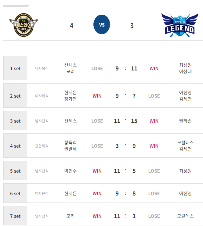 에스와이도 ‘얼음공주’ 한지은의 2승 맹활약으로 휴온스에 역전 승리했다. 세트스코어 1:3으로 밀린 5세트 박인수가 최성원을 11:5(8이닝)로 꺾고 추격을 시작 6세트 한지은이 이신영을 18이닝 장기전 끝에 9:8, 7세트서는 모리 유스케(일본)가 로빈슨 모랄레스(스페인)를 11:1(5이닝)로 물리치고 세트스코어 4:3 승리를 완성했다.