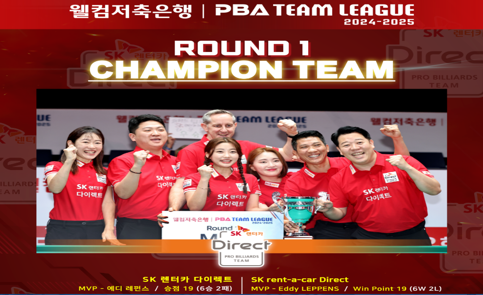- PBA 팀 리그 2라운드 개요: 2024-2025 웰컴저축은행 PBA 팀 리그 2라운드는 25일부터 9일 동안 고양 킨텍스 경기장에서 진행됩니다. 1라운드 우승팀 SK렌터카는 포스트시즌에 직행하며, 각 라운드의 우승팀이 중복될 경우 전체 순위로 결정됩니다.