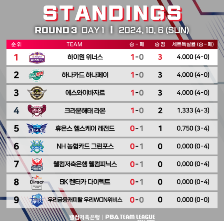 PBA 팀리그 3라운드 1일차 경기결과 - 하이원리조트와 에스와이 당구팀 쾌조의 스타트