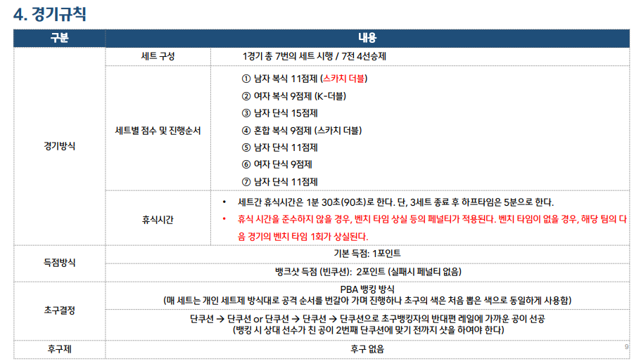 세트 간 휴식 시간은 1분 30초, 하프타임은 5분으로, 경기의 흐름이 끊기지 않도록 진행됩니다. 득점 방식 역시 흥미로운데요, 기본적인 득점은 1점, 뱅크샷 득점은 2점으로 설정되어 있어, 선수들의 전략적인 플레이가 요구됩니다. 🎯