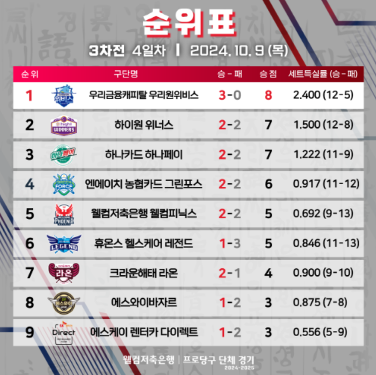 따라서 한 팀이 풀세트 경기에서 승리하면 총 2점을, 패배하면 1점을 얻게 됩니다. 이를 통해 승부가 치열한 경기에서도 어느 정도 득점이 인정되어 전체적인 순위 경쟁이 치열해질 수 있도록 하는 것이 이번 시즌 규정의 핵심 내용이라고 할 수 있습니다.