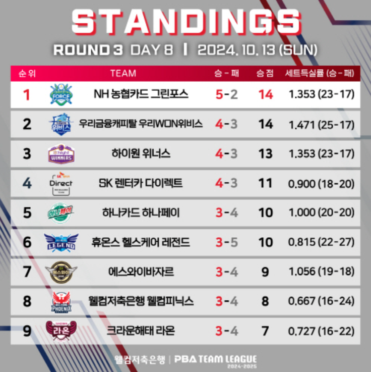 PBA 팀리그 3라운드 8일차 경기결과 성적 순위 feat. 당구팀별 인기 선수 정보