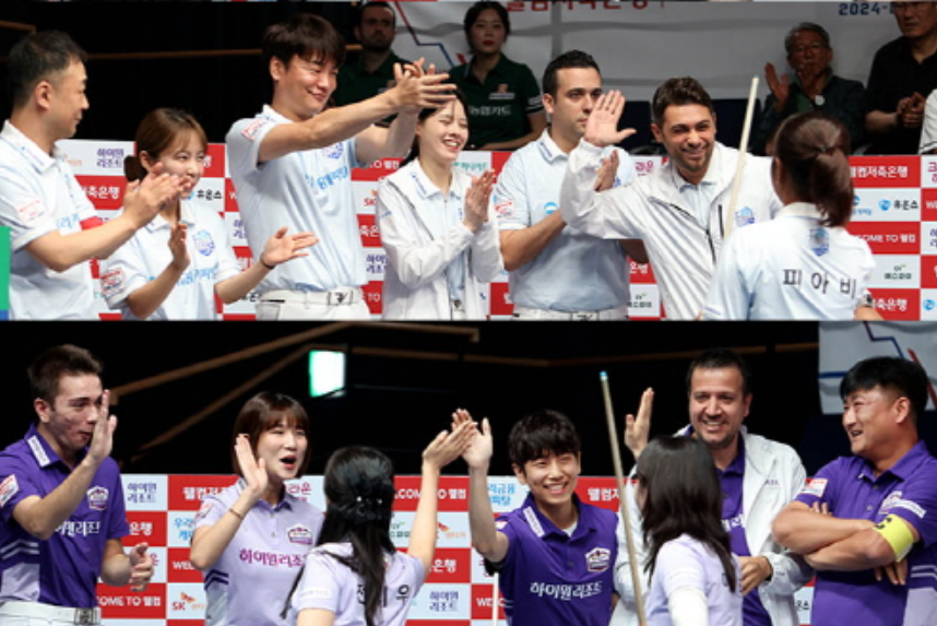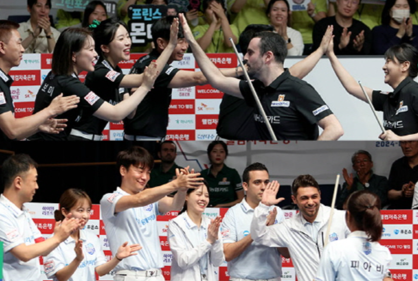 PBA 팀리그 3라운드 8일차 경기에서 우리금융캐피탈과 하이원리조트가 각각 패배하면서 승점 1씩 추가하는데 그쳤습니다. 이에 따라 선두 NH농협카드가 그대로 1위(승점 14)를 지켰고, 우리금융캐피탈과 하이원리조트가 공동 2-3위(승점 14, 13)를 차지했습니다.