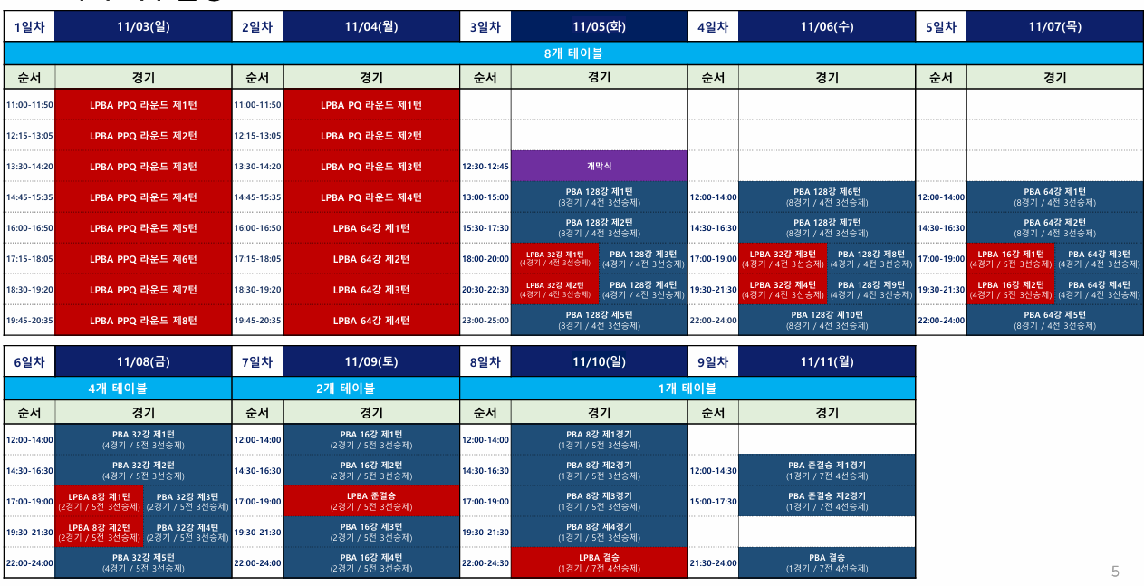 - 기간: LPBA는 11월 3일부터 11월 10일까지, PBA는 11월 5일부터 11월 11일까지 진행됩니다.