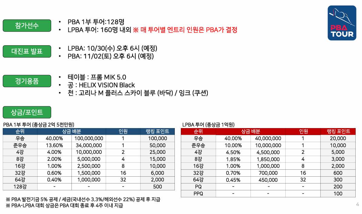 - 참가 선수: PBA 투어는 128명, LPBA 투어는 약 160명이 참가할 예정입니다.