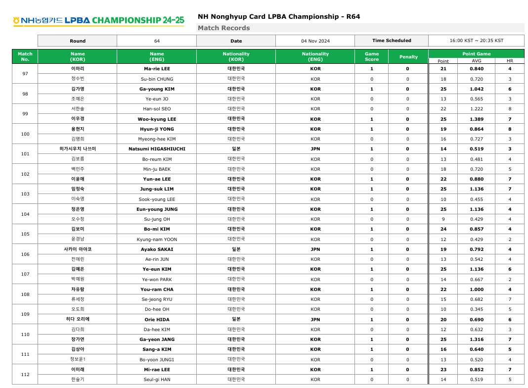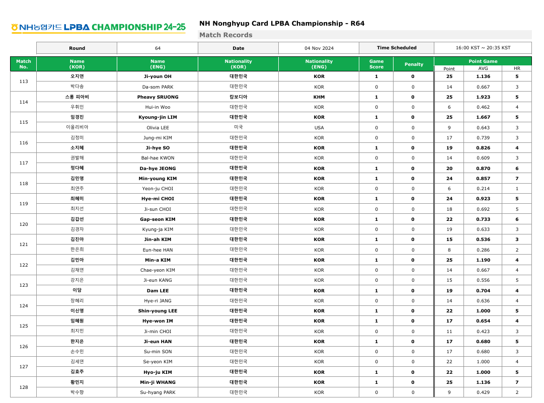 NH농협카드 LPBA 챔피언십 24-25 64강 경기결과는 아래와 같습니다.