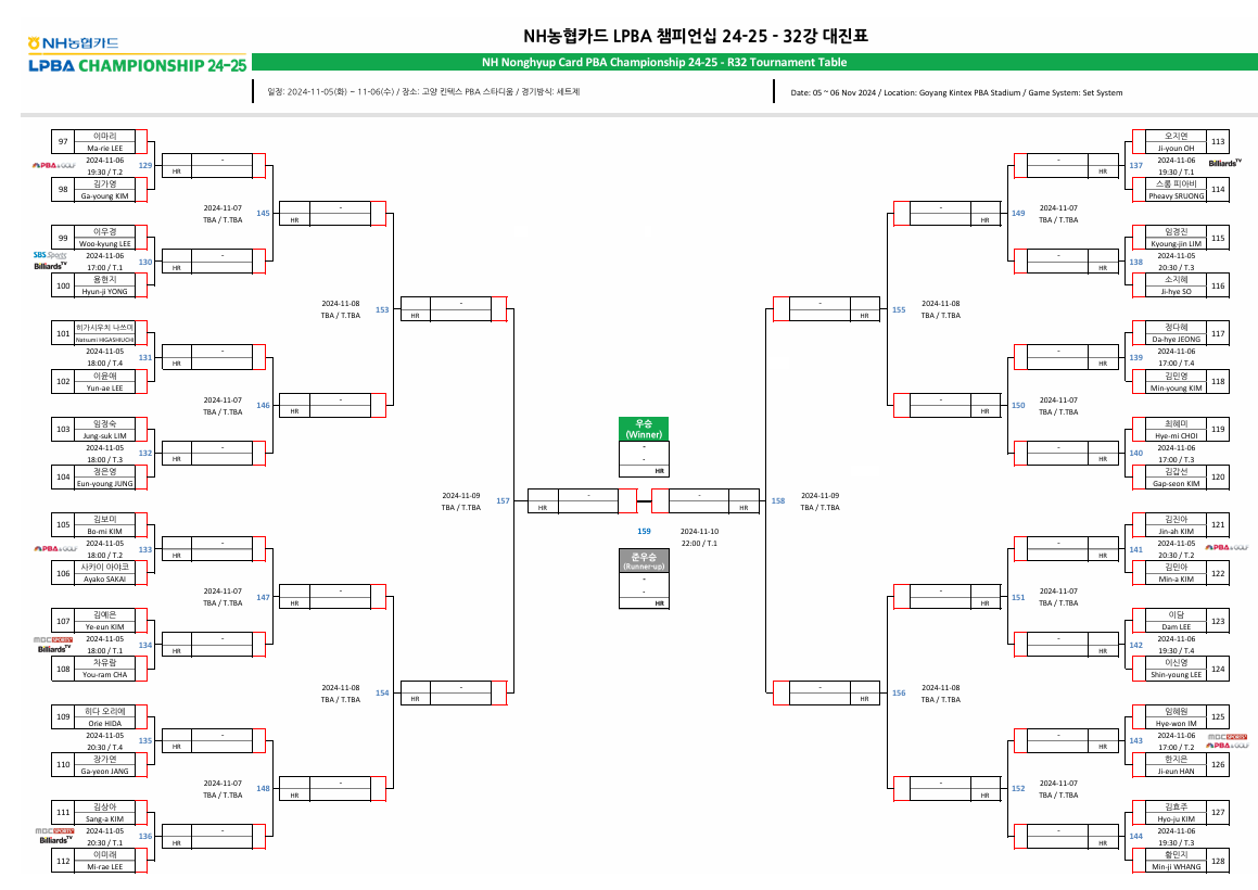 | NH농협카드 LPBA 챔피언십 24-25 - 32강 1일차 경기 결과, 16강 대진표 (3) | 2024.11.06 |