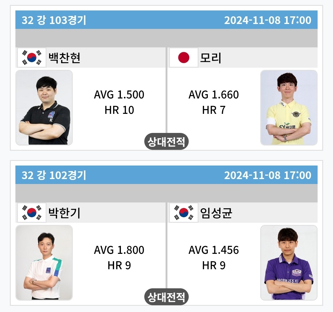 | NH농협카드 PBA 챔피언십 64강 대진표(프로당구 2024-25시즌) (34) | 2024.11.07 |