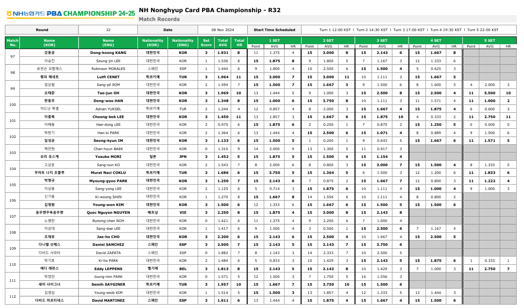 1. NH농협카드 PBA 챔피언십 32강 경기결과