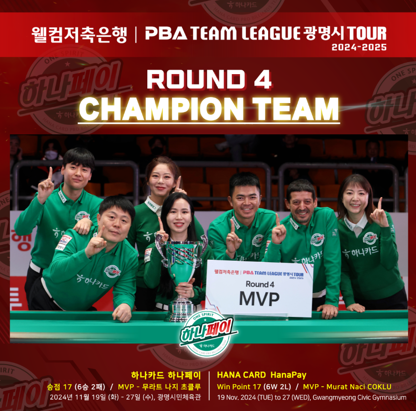 튀르키예 3쿠션 당구선수로 지난 시즌부터 PBA 무대에 출전하고 있는 무라트 나지 초클루는 4라운드 MVP로 선정되었으며, 하나카드 당구팀은 이번 우승으로 올 시즌 PBA 팀리그 우승팀을 가리는 포스트시즌 진출권을 확보하게 되었습니다.