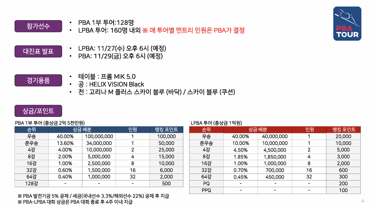 하이원리조트 PBA-LPBA 챔피언십 2024 대회요강- 일정 상금 경기방식 경기규칙