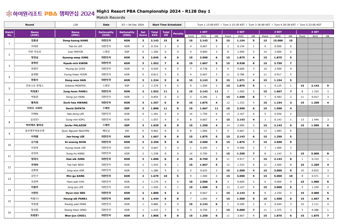 1. 하이원리조트 PBA 챔피언십128강 경기결과