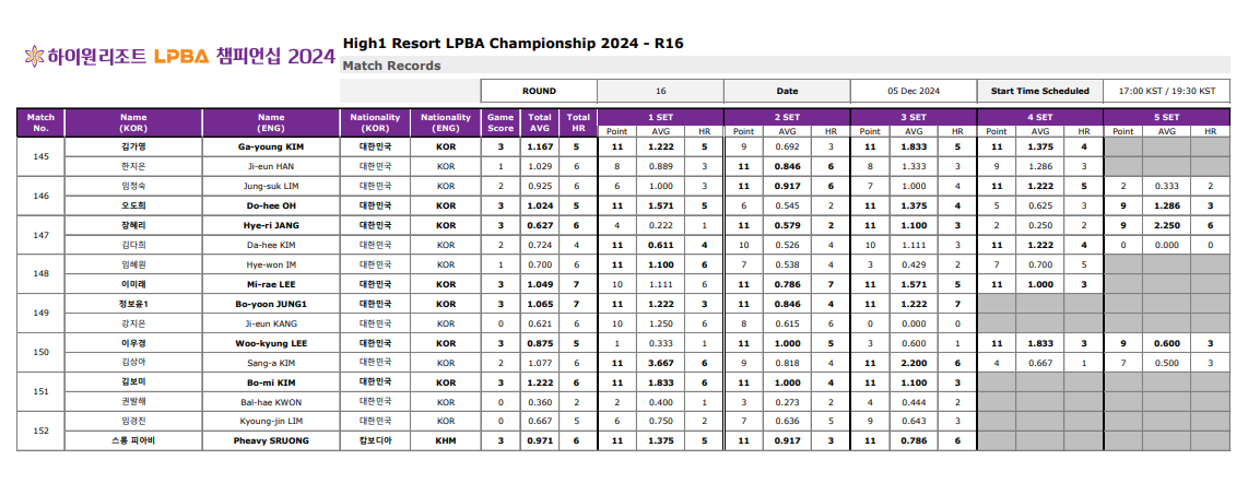 하이원리조트 LPBA 챔피언십 16강 경기결과