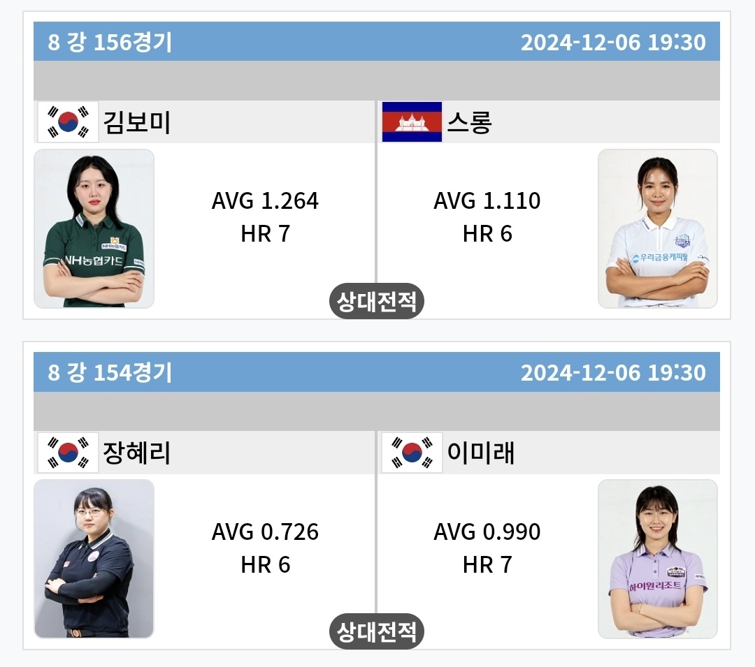 16강 경기결과에 따른 하이원리조트 LPBA 챔피언십 8강 대진표입니다. 장혜리 선수는 이미래 챔피언을 상대로 8강전을 펼칩니다. 정보윤 선수는 이우경 선수를 상대로 8강 진출을 가립니다. 김보미 선수는 lpba 최강 중에 한 명인 스롱 피아비 선수와 8강 진출전을 펼칩니다.