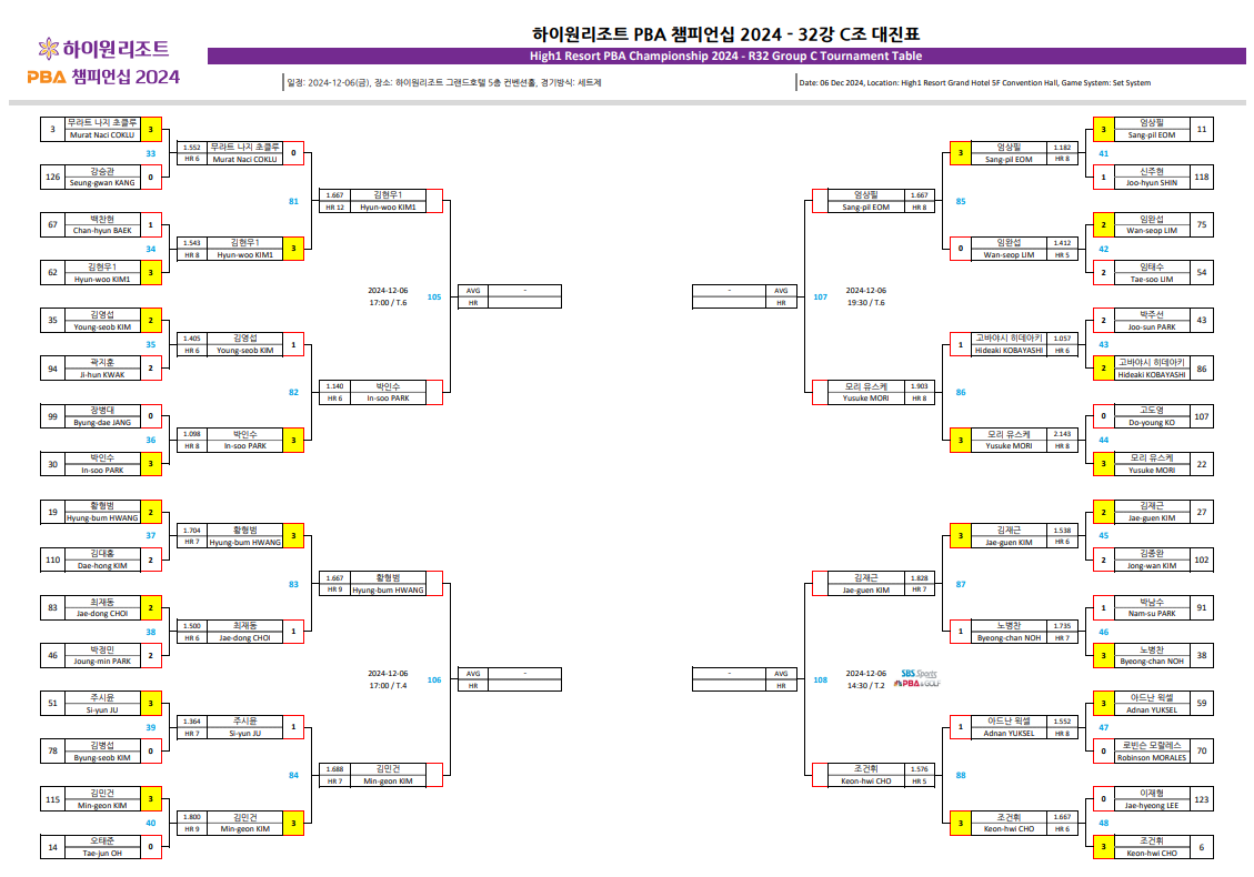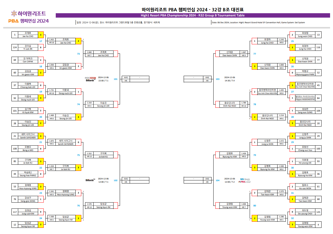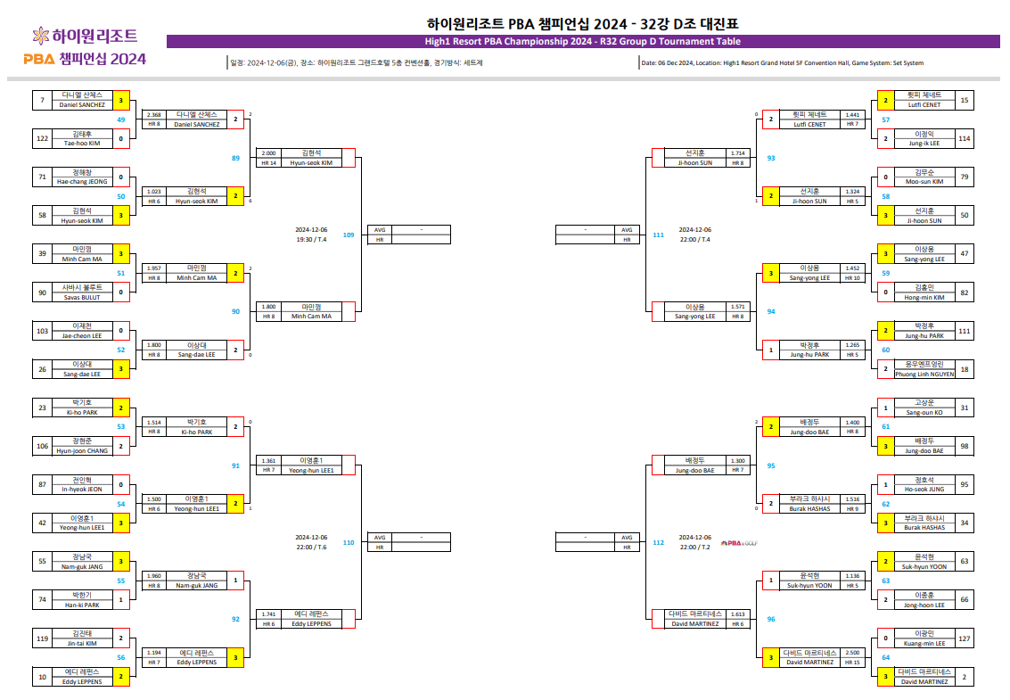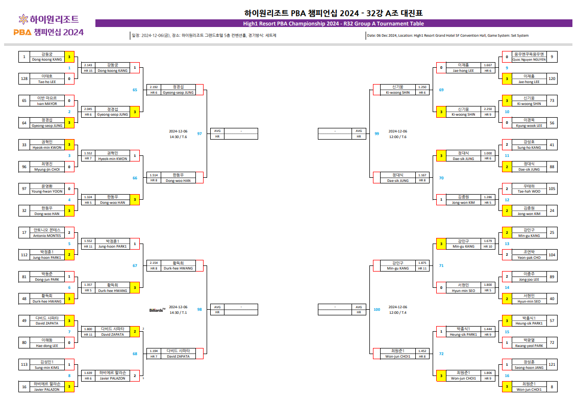 | 하이원리조트 PBA 챔피언십 16강 대진표 - 32강 경기결과 (프로당구 2024-25) (4) | 2024.12.07 |