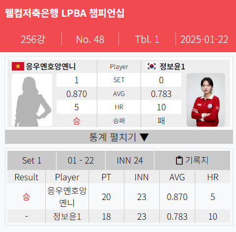 하지만 22 이닝에서 정보윤 선수가 하이런 10점을 치면서 20대 18까지 따라붙었으나 응우옌호앙옌니 선수도 하이런 5점을 치면서 승리를 내어주지 않았습니다.