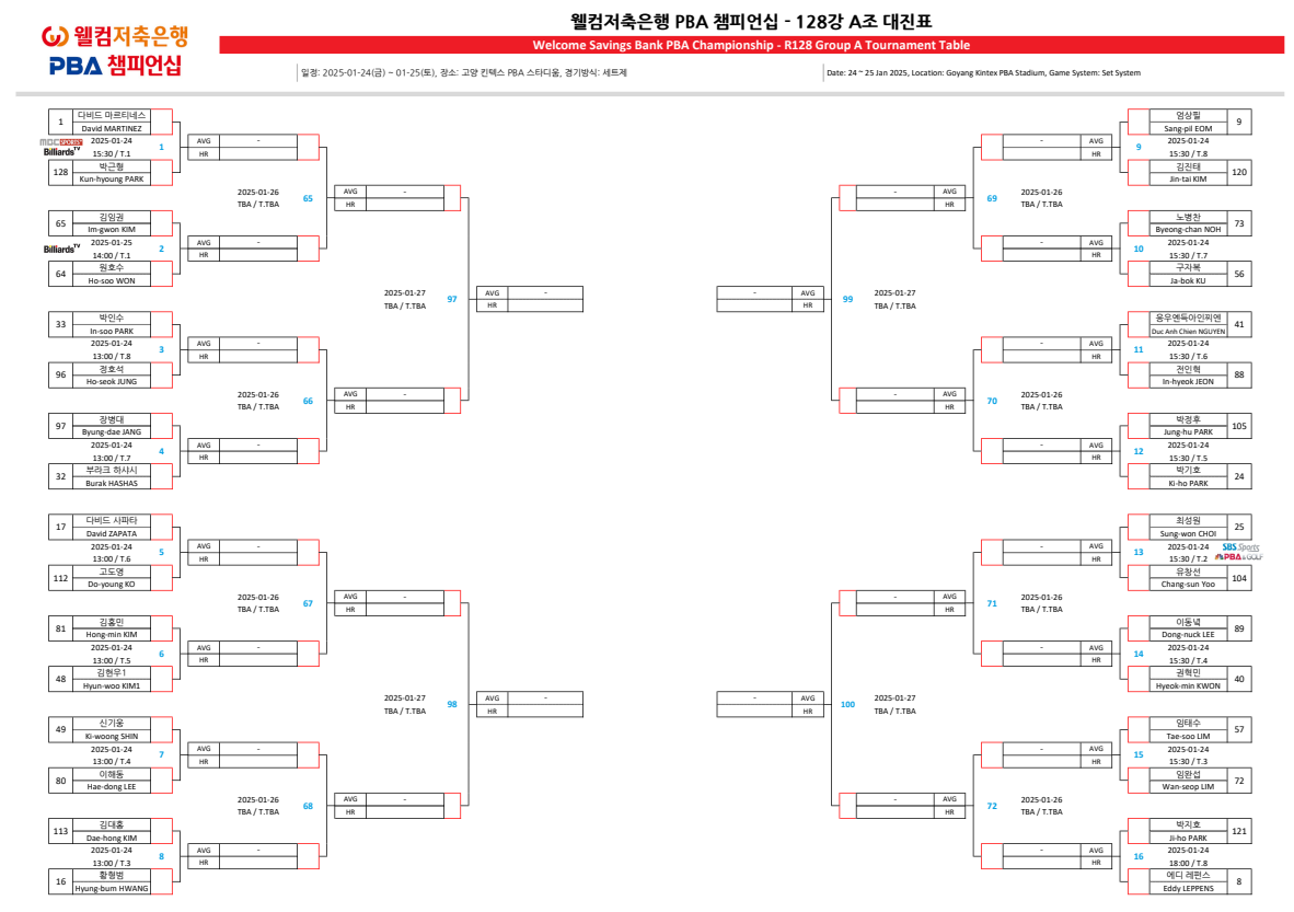 웰컴저축은행 PBA 챔피언십 128강 대진표(24-25시즌)