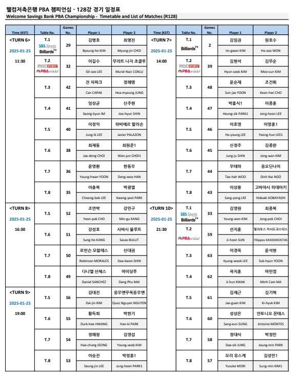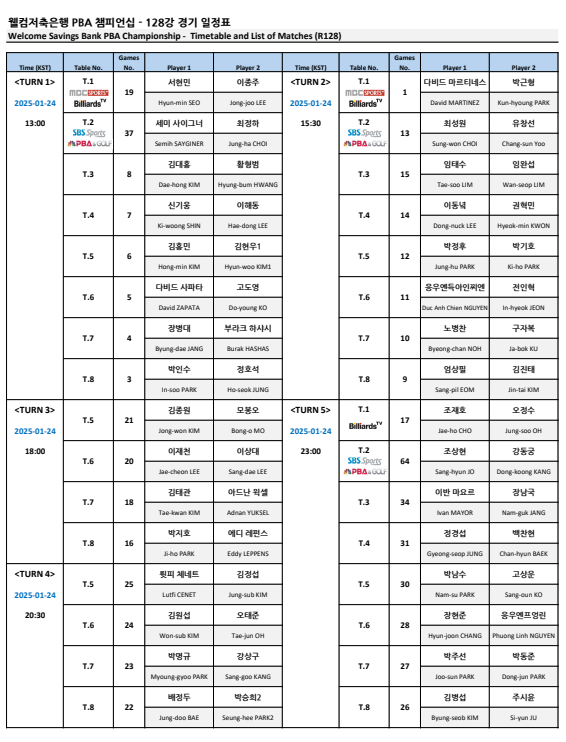 각 턴마다 8경기가 펼쳐지며 각 선수들의 대진표와 경기 시간이 나와 있으니 관심 있는 프로당구 선수의 경기 일정 및 경기시간, TV 중계방송 여부는 128강 경기 일정표를 확인하시기 바랍니다.